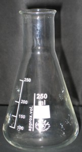 L'erlenmeyer permet de contenir un liquide (par exemple pour un dosage colorimétrique). Les graduations de volume indiquées sur l'erlenmeyer sont très approximatives.